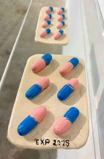 This approach also shapes the work of U5. U5 pays attention to overlooked things and everyday products that are in constant use but receive little attention. They usually pass through our hands and end up in the trash without a second thought. U5 mixes these materials, fuses them, layers them on top of each other, tears them apart, and reassembles them. Through continuous processing and appropriation, these things are brought to life. Because only when things are capable of evoking emotions connections between people and things can be created. The resulting works are repeatedly recombined, repurposed, repaired, collaged, and assembled. In exhibitions, they take on different states and properties. Cotton swabs, for example, are suitable as miniature building materials, as surface decorations, as porous skin. And they can be transferred to other materials and enlarged as desired. Cotton swabs and ceramic tablet blisters lie on glass shelves next to a set of bean teeth, vases stand next to fake fried eggs, and medicine capsules - also made of ceramic - are neighbors to small, fantastical interiors and exteriors.