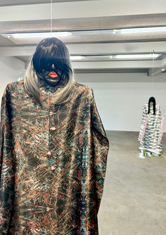 U5 uses these fabrics to tailor gown-like costumes with long, narrow sleeves, adorned with fringes, cords, and feathers. The masks hanging above them feature lush synthetic hair. U5 refer to the writer Ursula K. Le Guin (1929-2018), who rewrites human history in her essay “The Carrier Bag Theory of Fiction”: It was not the spear that marked the beginning, but the carrier bag; not hunting, but gathering; not aggressive techniques, but grounded, sustainable action. From this, Le Guin derives a vision of a cyclical way of life that is not geared towards permanent expansion.